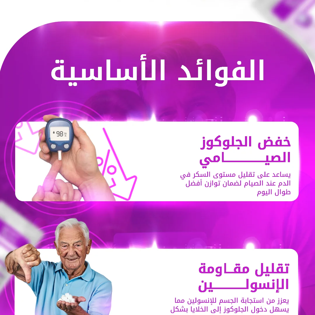• تقليل مقاومة الإنسولين: يعزز من استجابة الجسم للإنسولين مما يسهل دخول الجلوكوز إلى الخلايا بشكل طبيعي